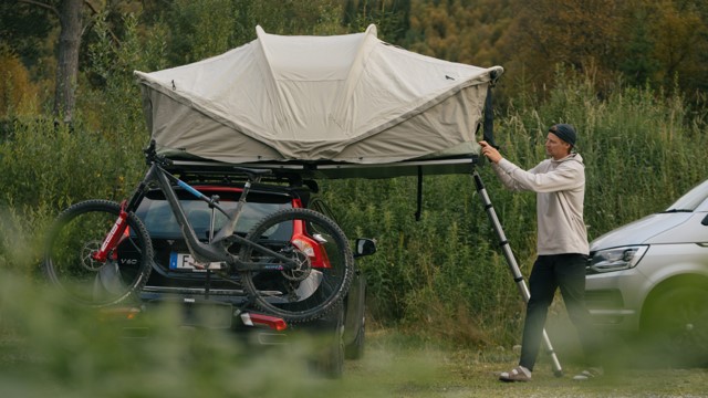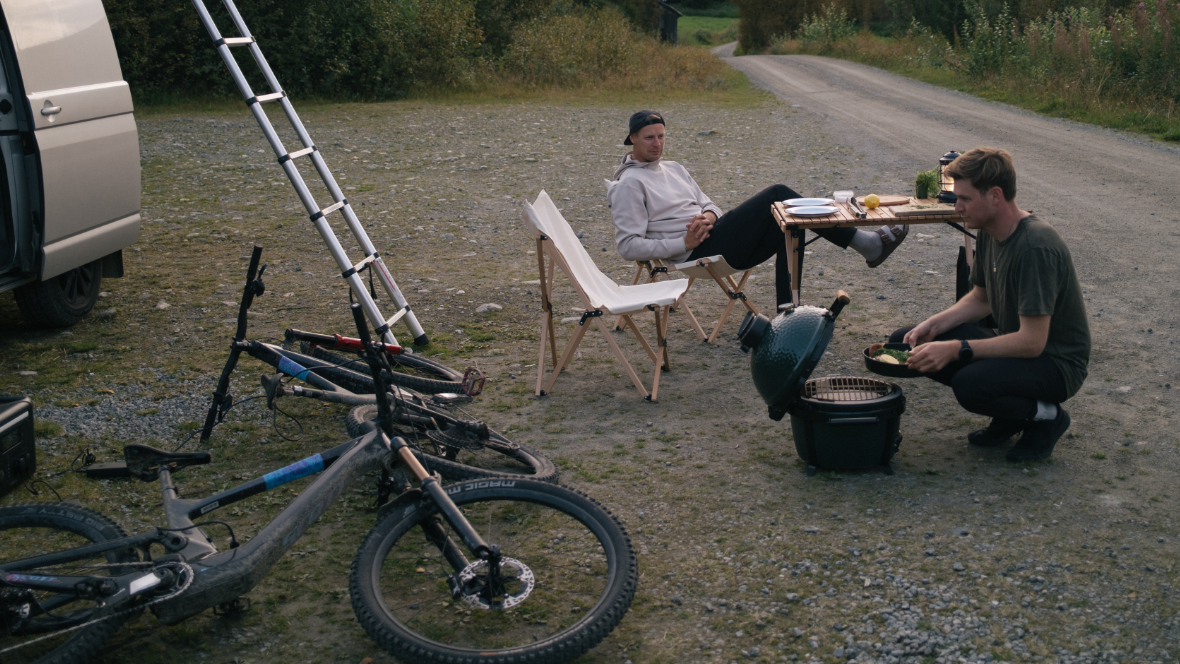 Wildcampen in Norwegen ist ein einmaliges Erlebnis. Umgeben von majestätischen Gipfeln und Fjorden schlug das Team ihr Lager unter freiem Himmel auf. Während Martin das Lager für die Nacht herrichtete, grillte Scotty ein frisches Lachsfilet über dem Grill. In der Nähe luden die Bikes ihre Akkus, um mit voller Power in den nächsten Tag starten zu können. Mit Bier in der Hand tauschten sie Geschichten aus und ließ die erlebten Trails noch einmal Revue passieren.